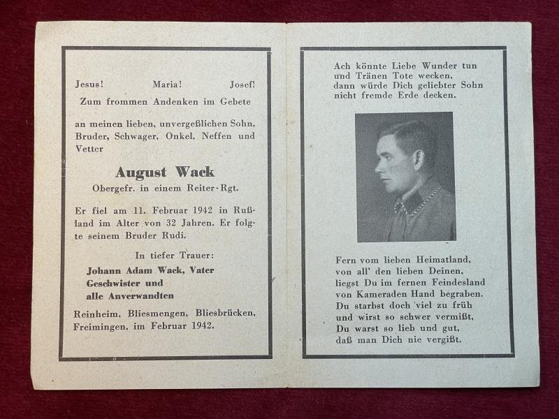 In a very good condition a death notice from a private in a cavalry regiment The death notice is from August Wack and he died in Russia. His brother died before he did.