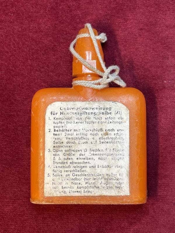 In a very good condition orange bakelite bottle Hautentgiftungssalbe 41. Production fill dated november 1943 on the bottom. Also Hautentgiftungssalbe Maker mark DSU 1943. DSU stands for the maker Rheinische Gummi- u. Celluloid-Fabrik from Mannheim-Neckarau On the back is the user manual. In the bottle are dryed out remains of the oinment.