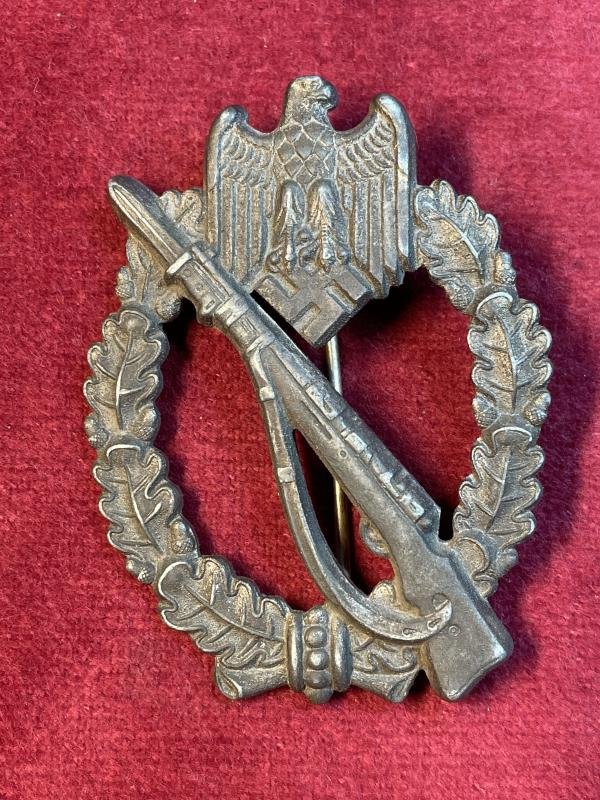 In a very good condition an Infantry Assualt Badge in Zink The catch is broken, hence the price. This unmarked badge can be assigned to the S.H.u.Co company. With stands for Sohni, Heubach & Co. from Idar-Oberstein This is a zink badge, therefor it is not magnetic.