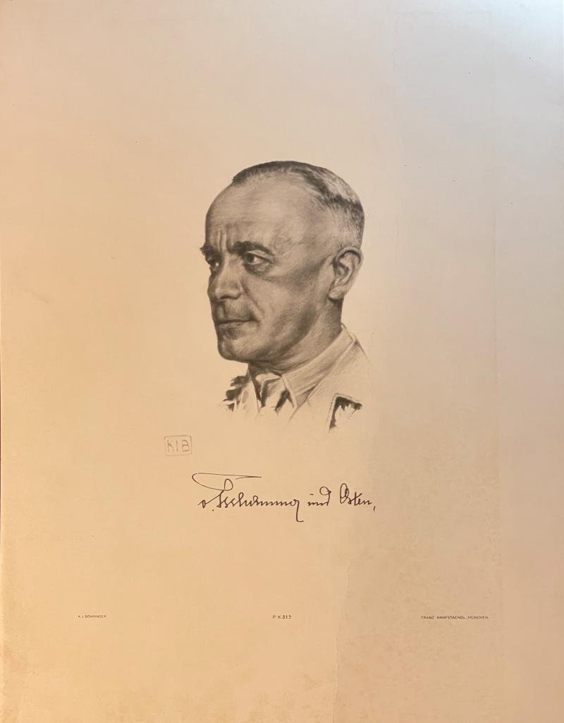 In an excellent condition a portrait of Hans von Tschammer und Osten. The drawning was made by K.J. Böhringer and published by Franz Hanfstaengel from München. It is also marked on the front with P.K. 513 and KIB which are the initials of the maker. Hans von Tschammer und Osten (25 October 1887 – 25 March 1943) was a German sport official, SA leader and a member of the Reichstag for the Nazi Party of Nazi Germany. During the times of the Weimar Republic he joined the SA, becoming a Gruppenführer, 'Group Leader', rising up to become a colonel of the paramilitary organization and later a member of the Reichstag. Von Tschammer disbanded the DRA, branded as a 'bourgeois entity', on 5 May 1933 (officially 10 May) and re-established it as a Nazi-oriented organization, the Deutscher Reichsbund für Leibesübungen (DRL). Size is +/- 33 cm x 26 cm This is a time-period reproduction. This means it is made during the 3rd Reich.