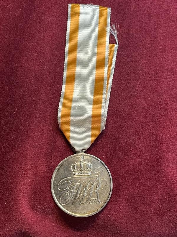In a very good condition a Prussian general honor medal 2nd class. The general medal of honor was granted by King Friedrich Wilhelm III. Donated on January 18, 1810. At that time under the designation General Merit Medal, this was awarded in 2 classes as a medal, gold and silver. In 1814 the 1st class was converted into a silver cross. As early as 1830, the 1st class was converted into the Red Eagle Order 4th Class or awarded instead. From this point on, the general badge of honor was one class. The award was the most frequently given award in the Kingdom of Prussia due to the long award period. Over the long period, changes were made to the stamps and various changes to the ribbons, as well as additional attributes. Anniversary tags were introduced in 1851. In 1890 a general gold medal was donated again. In 1912 the Foundation of the General Decoration of Honor in bronze followed. As early as 1900, the gold medal was replaced by the cross of the general badge of honor. This could also be awarded with a crown as an upgrade. During the war of 1870/71 the commemorative ribbon and the red cross were donated. Medals with additions such as the red cross are often forged in order to achieve a price increase. Prices are based on the chronological allocation of the various stamps on the medal. Early medals with a small crown and filed eyelet are valued significantly higher than the variant shown. Round silver medal with a raised rim and a large, parallel eyelet on top. Front: At the edge a laurel wreath tied with a bow at the bottom. In the enclosed field, the raised, 3-line font: - MERIT - / - TO - / - THE - STATE -. Back: In the center above the 5-arched Prussian royal crown. Underneath are the ornate and squiggled letters - F - W - R -. Under the - R - between the arches the Roman 3 - III -. Tape: white 35 mm, white edges 2.5 mm, orange side stripes 7 mm.
