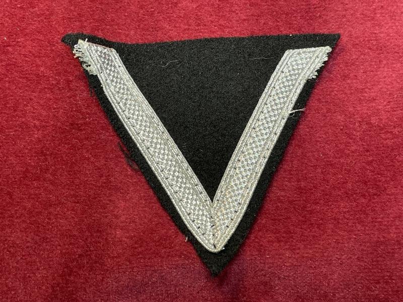 In an excellent condition gefreiter rank chevron for an SS-Sturmmann The insignia fabric is a black patch with a single silver stripe