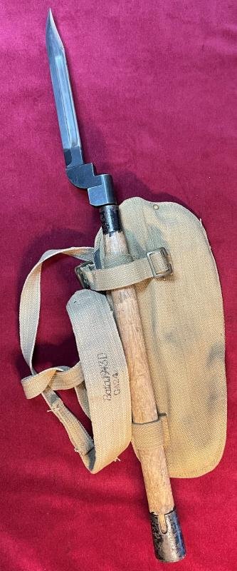 In an excellent condition and complete set of a British entrenching tool & trusting weapon which were used in WWII and toolhead was also used in late WWI The set is made out of the following items: 1. Webbing carrier (canvas) pattern 37, marked Bata 1943 D C acceptance arrow 24 2. MKII pattern 37 entrenching tool 3. MKI No. 9 bayonet, no markings but excellent condition 4. 1918 dated toolhead (pick axe & shuffle) marked with acceptance arrow 9, 1918 ITD
