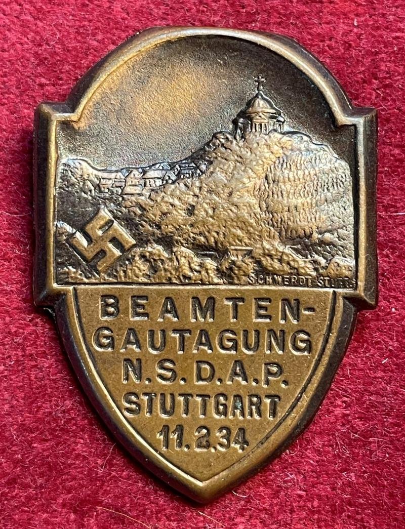 Very nice badge for the NSDAP Beamtengautagung Stuttgart 1934. Frontside: City of Stuttgart, Swastika Schwerdt-Stutt. Beamten-Gautagung N.S.D.A.P. Stuttgart 11.2.34. Maker markerd Schwerdt from Stuttgart Backside: Safety pin.