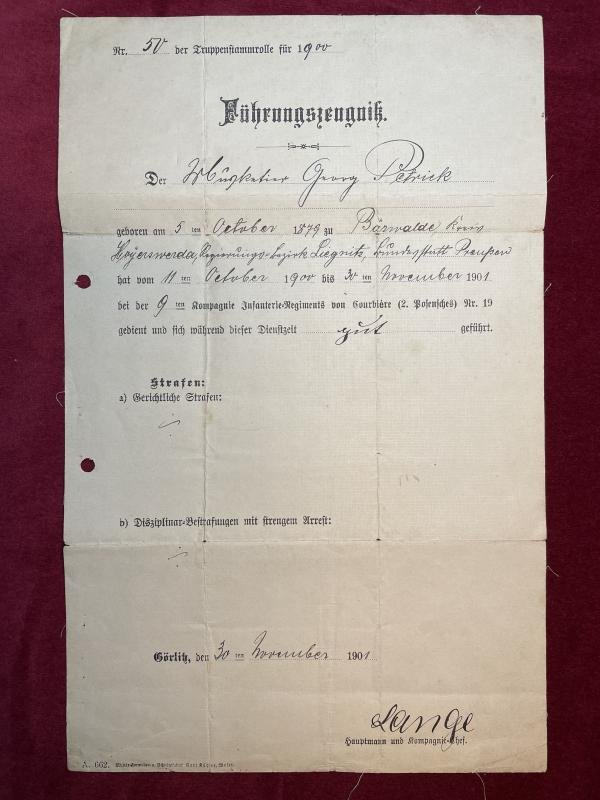 Service record for Georg Patrick from October 11th 1900 until November 30th 1901. He served at the 9th kompagnie infanterie-regiments von Courbiere (2. Posensches) nr. 19. He has served his time in the service 'gut' which means good and he has not received any punishment or disciplinary actions against him during his service time. These records could be used to show an civilian employer or another military one that you are trustworthy and hard worker.