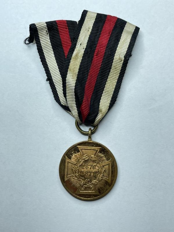 Instituted 20.05.1871 by King and Emperor Wilhelm I. for soldiers fighting in the Franco-Prussian War. Combatant version, made of bronze from captured enemy canons. With original Prussian ribbon Coin is not cleaned!