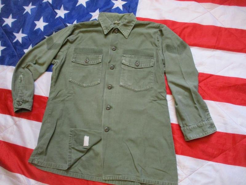 A 1000% GENUINE US ARMY / AIR FOCE ISSUE COTTON SATEEN UTILITY SHIRT in OG-107 COLOUR GREEN, CLASSIC 1960s TO 70'S VIETNAM WAR ISSUE ITS MADE IN USA ..BUT ISSUE LABEL FADED FOR DATE / MAKER ..ITS DEFO AND 1960'S -70'S VIETNAM WAR ERA ONE FEATURES = THE SHIRT HAS , BUTTON FRONT , 2 BUTTON POCKETS , BUTTON CUFFS . collar size label and lower hem info label INSIGNIA = ALL INSIGNIA HAS BEEN REMOVED AND shadow on arms AND CHEST WERE AIR FORCE RANK STRIPES HAVE BEEN AND CHEST TAPES REMOVED size = LIKE A LARGE to XL SIZE but please go off measurements if ya gona wear it ( MEASURES 24' or 61cm ARMPIT TO ARM PIT ) AND 29' COLLAR TO HEM . 18' SHOULDER TO SHOULDER / ARM PIT TO CUFF IS 20' / SHOULDER SEAM TO CUFF END IS 22' ) CONDITION = VINTAGE over 55 years old shirt ...STILL A GOOD SHIRT ..no holes rips or damage . looks real good as in pictures . COLOUR = VIETNAM WAR OG-107 = OLIVE GREEN SHADE 107