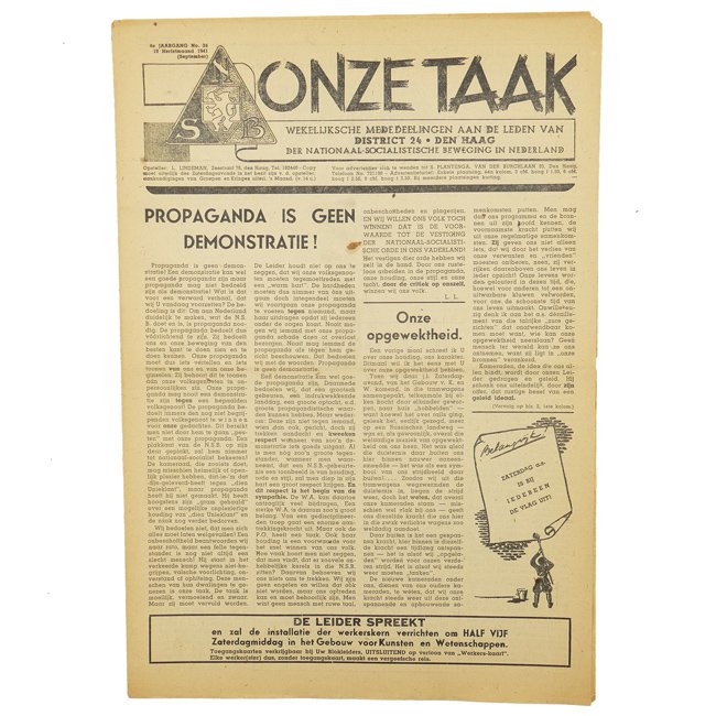 NSB Newspaper 'Onze Taak'. The Dutch 'Nationaal-Socialistische Beweging' (National Socialist Movement) was founded by 'Anton Mussert' in December 1931 and was a Dutch pro-German Nazi Party. 'Onze Taak' was a weekly newspaper for members of the District 24 'Den Haag'. This is the 34th edition from the 4th year, dated 19 September 1941. The newspaper is showing some staining and minor damages. Rare and hard to find example in good used condition.