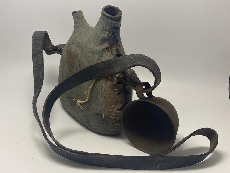 As found, First war French water canteen complete with leather strap and canteen cup. Bottle retains a blue wool cover however no corks. These are easily replaced if required. Cup has a bit of surface rust but nothing major and is still quite smooth without roughness and parts of original paint visible. Leather strap is complete, it remains flexible however some minor cracks in the strap are visible. A nice period item.