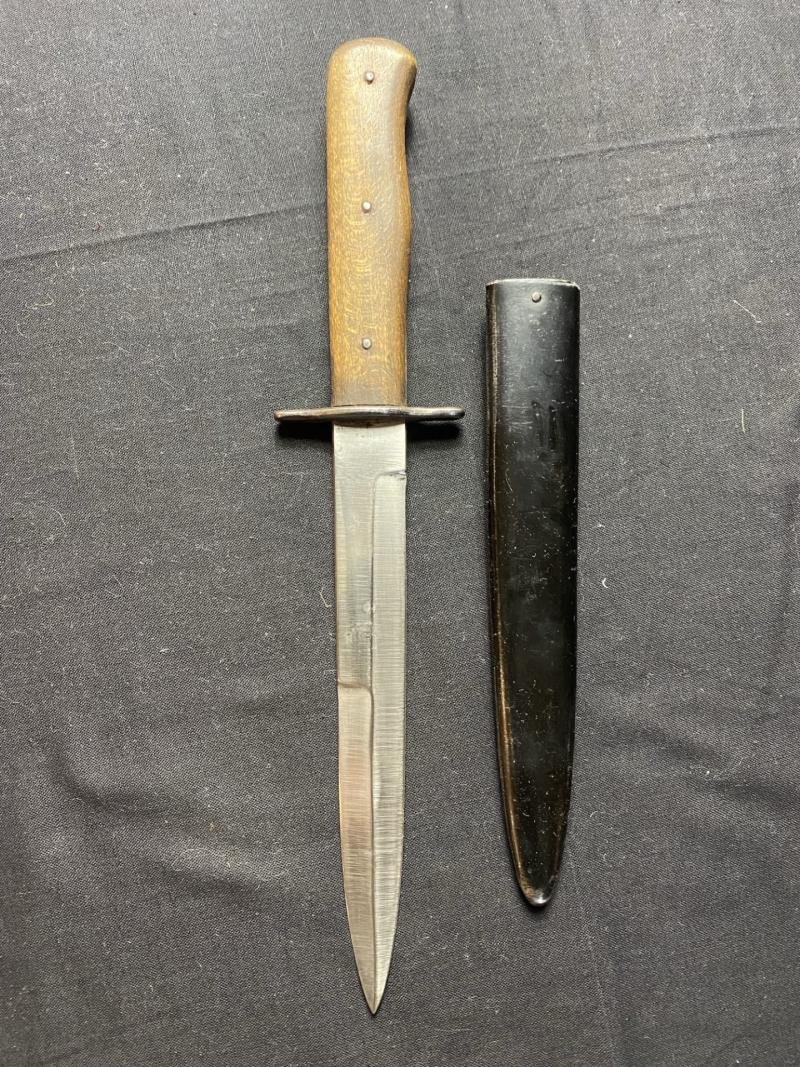 This is a very nice Luftwaffe Fighting knife/boot knife with its scabbard, the handle is in very good condition, the blade has its Luftwaffe acceptance stamp and this would be hard to find a nice one, a nice piece to add to the collection. This is an age restricted item. Proof of age must be provided. U.K. Sales Only.