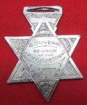 Original era manufacture. Large, cast silver color six pointed star with an integral suspension loop at the top. The engraving proclaims it to be a souvenir of the Re-Union of the Army of the Potomac, held in Detroit in 1882. Sham Battle, Banquet, Prize Drill, all to be enjoyed at this event. Measures roughly 2 x 2.5 inches, no ribbon. The Sham battle listing is very interesting to me, early re-enactors?