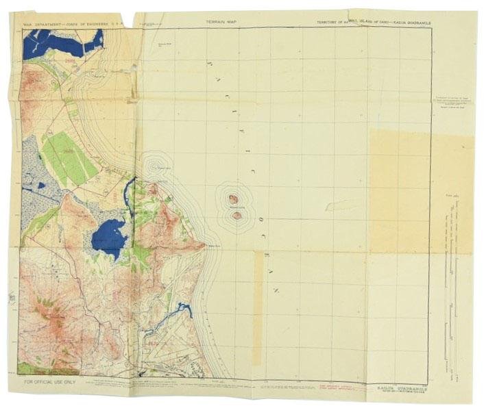 In a nice used condition a USAFICPA (U.S. Army Forces in Central Pacific Area) Corps of Engineers Mapcard of the Kailua Quadrangle region Hawaii. The mapcard is dated 1943 and comes in 70x80cm approx. It has some damage of use but a hard to find mapcard!