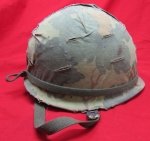 Original period manufacture. Rear seam, non reflective edge steel helmet shell in original finish, with original sewn dark OD chin straps, missing the blackened steel fitting on the short side. Original Mitchell pattern camouflage cover marked DSA100-69-F6833, and below, 8515-261-6833 MPLS.SOC.F/T BLIND INC. honest service use and wear to the cover. High pressure liner with dark OD webbing, broken in the front, no sweatband or nape strap. Soldiers name and service number painted in green paint on the side. Grommet in the front of the helmet.