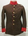 Original period manufacture. Brown wool coat body, with a red wool piping, collar and cuffs. Full complement of original Artillery pattern buttons, some variation in manufacturers. Single gold wire with black thread left shoulder strap, small Artillery button at the rear seam of each cuff. Gray silk body lining, striped silk sleeve lining with a red silk lining to the skirt. No moth issues, fading to the surface of the collar as shown, size about 36.