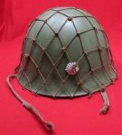 Original period manufacture. An interesting example of the Japanese WWII Civil helmet. Military pattern shell without ventilator holes in the top, painted paper liner with adjusting string and a military type cloth chinstrap. An original appearing net is on the exterior, which has portions of the chinstrap looped through the bottom along the helmet's edge. Aluminum Police insignia on the front.