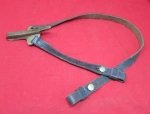 Original period manufacture. A solid example in black leather with a large brass hook at the top. Clear markings on one of the straps, Rock Island Arsenal. The leather is very pliable, displaying minimal wear and use. Designed for use with the Prairie Belt.