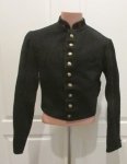 Original era manufacture. Waist length, dark blue wool jacket, with red wool 2's stitched to collar patches of basic cloth (dark blue, correct for Foreign Legion) then sewn directly to the collar. Foreign Legion buttons throughout, including the securing button for the leather lined, wool bayonet support strap. Heavy white cotton lining with numerous French issue markings, including a circular one from the Nantes Depot, marked 3rd Quarter 1888. In addition, several costume house markings can be seen. Size is a 36 long. Overall the material is in clean condition, with a two inch repair on the chest visible on the left side. Thank goodness for the costume houses, they were the ones who saved many of these old uniforms we collectors enjoy so much from the rag-pickers.