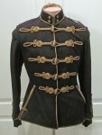 Original period manufacture. Dark blue gabardine wool coat with gold wire frogging and trim. Complete with all decoration and toggle closure buttons. White silk body lining, with red silk skirt lining. No moth issues to report, some of the decorative trim has come loose, and the inner silk lining of the collar shows considerable wear. The shoulder cord is present however the small attaching button is missing. Otherwise normal age and wear.