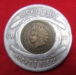 Original era manufacture. US 1903 Lucky Penny Pocket Piece by Havelock Tobacco. Original Indian Head Penny, set into an aluminum disc.