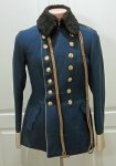 Original period manufacture. Blue wool coat with white wool cuffs and piping, gold color buttons throughout. Black lambswool collar, with two heavy gold wire cords for draping the coat on the wearer's shoulder. These have been added, or replaced, and a merely tacked on at this point. Minor mothing on the back of the coat as shown. Padded black silk body and skirt lining, with a nice tailor's label and owners name on the inside pocket. The inner lining of the collar was removed for some reason. Size about 38-40 long.