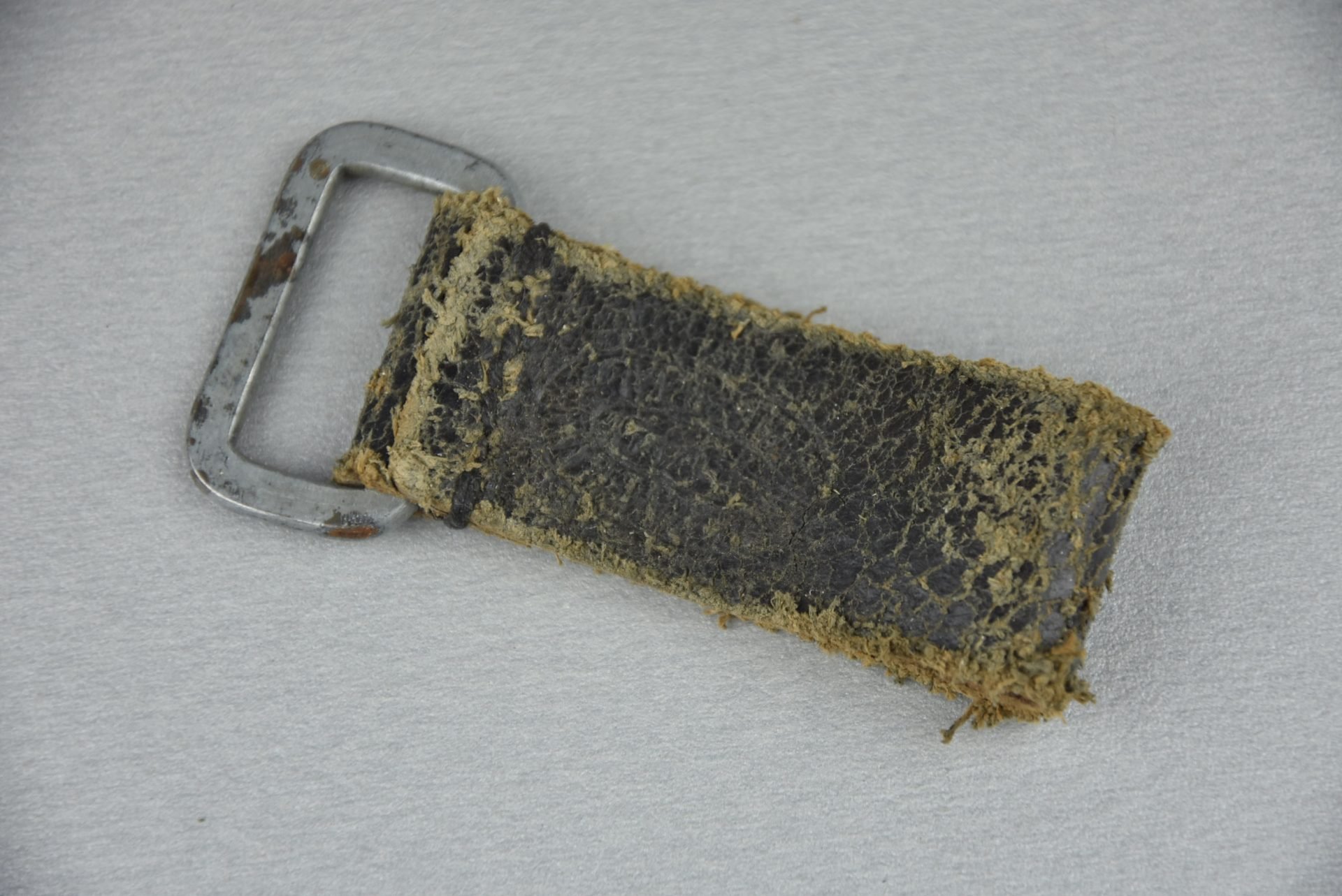 Genuine Wehrmacht D-ring belt loop to carry a Y-strap or rucksack when no ammunition pouches were used. Executed in black leather with a steel D-ring. Marker marked by Rahm & Kampmann, Wuppertal and dated 1940.