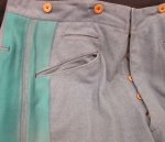 Original period manufacture. Straight legged, pipe gray wool trousers, with a wide green wool double stripe down the outside of each leg. Waist measures 36 inches, inseam measures 32 inches. Single hip pocket, two front pockets with a watch pocket. Old costume house inkstamp in the lining, with a Vienna (Wien) tailors tag, with the man's name and date of 1910. Evidence of the back of the lining material having been modified, no real moth issues to mention.