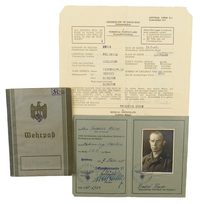 The Wehrpaß belonged to Gefreiter 'Friedrich Kruse', he came into active military service on 25 August 1939. He served in the 'Flak-Transp.Battr.2/111'. He was promoted to 'Gefreiten'. He was awarded with the 1 October 1938 Medal. He took part in the invasion of Holland and France and was stationed in France with his Flak unit to protect against British attacks. The Wehrpaß comes together with his military driver's license (Wehrmacht-Führerschein) including his portrait photo showing him wearing a Flak Flight Blouse. Also included is his Certificate of Discharge. Interesting original grouping.