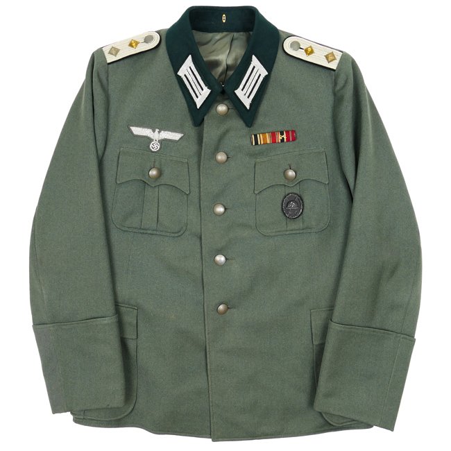 Wehrmacht (Heer) Officer's Tunic as intended for a 'Hauptmann der Pioniere' (Engineers). The German Officer's service tunic followed the basic design of the Enlisted Men/NCO's field blouse, the most readily visible difference (besides the insignia) are the turned up French cuffs. This is a nice quality privately purchased M36-style field-grey wool tunic with dark-green collar. The tunic is in overall very good condition with minor traces of usage. The buttons are all the field-grey pebbled examples. The tunic is complete with all original applied insignia, including a nicely hand-embroiderd breast-eagle embroidered on not often encountered fieldgrey coloured wool matching with the tunic, shoulder boards and collar tabs. Both the collar tabs shoulder-boards are piped in the black 'Truppenfarbe' (branch colour) indicating the 'Pioniere' (Engineers). The shoulder-boards are of the sew-in type, the shoulder-boards are both having two pips attached indicating an 'Hauptmann' within a 'Pionier' Unit. There are loops to the wearer's left breast-pocket having an original Black Wound Badge attached as found together. A nice 5-piece ribbon-bar is attached through 3 loops above the wearer's left breast-pocket. There is a nice tailor's label of the company 'Spohn & Klaiber' from Ulm.a.D. Nice original 'Pionier' Officer's tunic in very good condition.