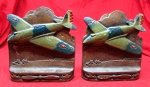 Original period manufacture. Pressed sawdust bookends with metal braces. Displayed on the uprights are P-40 Warhawks in a camouflage paint scheme. Normal age and wear, each measures 5 x 3 x 5.5 inches.