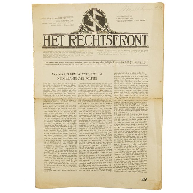 'Het Rechtsfront' Newspaper. Het Rechtsfront was bedoeld als organisatie van allen die op enigerlei wijze in dienst stonden van de handhaving van het recht in de Nederlandse staat. Het Front bestond uit de afdelingen Justitie (A), politie en de afdelingen voor vrije beroepen als advocaten en notarissen (C). Men kon lid zijn van het Rechtsfront zonder lid te zijn van de N.S.B., men moest echter wel bezield zijn met de Nationaal Socialistische gedachte. Later konden ook burgemeesters lid worden, evenals de mannen van de in het leven geroepen Vrijwillige Hulppolitie. De krant 'Het Rechtsfront' werd tweemaal per maand verspreid om uitdrukking te geven aan wat er leeft in de kringen van Justitie, Politie, advocaten en notarissen. This is edition 45 of the 1st Winter Month 1942. The newspaper is showing normal traces of usage. Extremely rare and hard to find original newspaper.