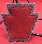 Original era manufacture. US WWII 28th Division shoulder sleeve insignia.Pennsylvania's Bloody Bucket. Red wool felt keystone, machine sewn to a section of WWI uniform cloth. Normal age and wear.