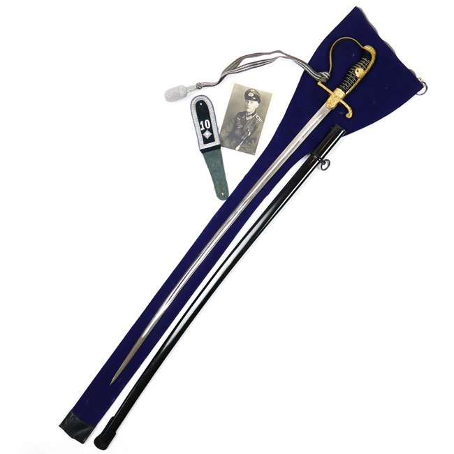 Wehrmacht (Heer) Officer's Sword/Saber (SĂ€bel fĂŒr Offiziere). The sword has a molded, black, bakelite grip with the correct horizontal silver wire wrap. The grip is in overall good condition with no chips or cracks. The obverse rounded tip, shield shaped, languet shows an embossed Wehrmacht style eagle with outstretched wings. The blade is nicely maker marked by the company of 'E.u.F. Hörster' from Solingen. The blade is in perfect condition. The scabbard retains almost all of its original black paint showing minor traces of usage and scratches, see photos. The sword comes with its original Portepee and blue woolen carrying bag (StoffhĂŒlle). The carrying bag is having a functional zipper. Included with the sword is an original single shoulder-strap and portrait-photo from the bearer, being a 'Feldwebel der Nachschub-Truppen' (Transport Troops), photographed with his sword. The single shoulder-strap can easily being recognized in the photograph. This set was recently found together in Austria. This is one of the nicest swords I've had on offer. Stunning original grouping.