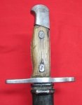 Original era manufacture. Another example of the smaller contractors of the Type 30 bayonet. Bright finished blade, straight guard, contoured wood grips with a rounded bird-head pommel.The blade displays cleaned corrosion near the tip, but remains bright, with the guard and pommel having a cleaned steel patina finish. The wooden grips have been cleaned, with typical marring, denting and some chipping on the surfaces. Near dent-free, black painted steel scabbard which shows evidence of old corrosion pitting.