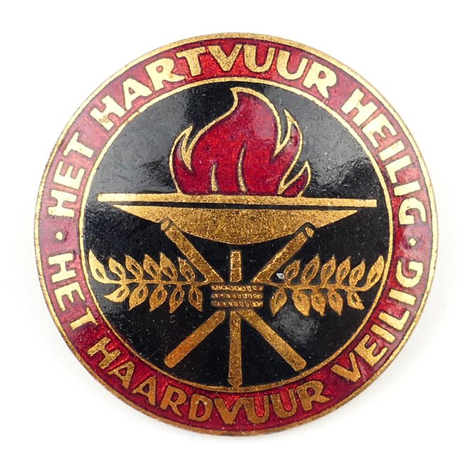 NSVO 'Het hartvuur heilig - Het haardvuur veilig' Badge (Draagteken). The National Socialist Women's Organization (NSVO) was the name under which NSB women between 1938 and 1945 could actively take part in the development and expansion of Dutch National Socialism. The Dutch 'Nationaal-Socialistische Beweging' (National Socialist Movement) was founded by 'Anton Mussert' in December 1931 and was a Dutch pro-German Nazi Party. The badge is a nice enameled example, the badge has never been cleaned nor polished, there are only some small scratches/dirt caused by years of storage. The badge is nicely maker marked with 'HFB'. The badge is having a functional pin/catch system. Nice original badge in very good condition.
