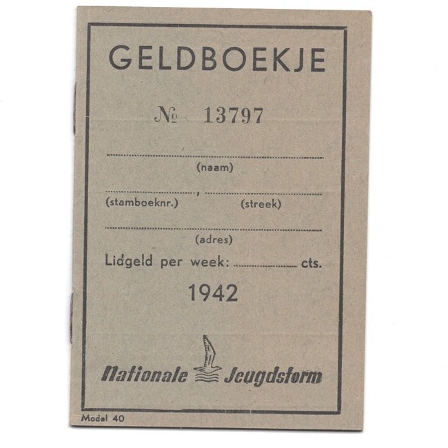 NJS - 'Jeugdstorm' Geldboekje 1942 (Contribution Booklet). The 'Nationale Jeugdstorm' (NJS) was a Dutch youth movement shortly before and during World War II, inspired by the German Hitler Youth. The organization was formally separate from, but in practicehad close ties with the NSB. Various stamps have been pasted in the booklet. Nice original contribution booklet.