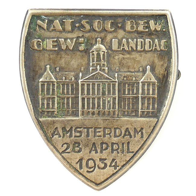 NSB 'Landdag Amsterdam' Tinnie.This event was held at 28 April 1934 in Amsterdam. The Dutch 'Nationaal-Socialistische Beweging' (National Socialist Movement) was founded by 'Anton Mussert' in December 1931 and was a Dutch pro-German Nazi Party. The tinnie comes on its functional pin/catch system, the tinnie is not visible maker marked. Rare original early NSB tinnie in very good condition.