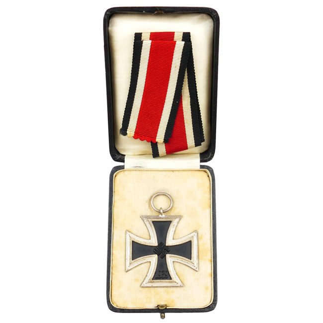 Iron Cross 2nd Class (Eisernes Kreuz 2. Klasse) in original presentation case. On 1 September 1939 Hitler reinstituted the Iron Cross (First time in 1813). The 2nd class cross was for award to personnel who performed a single act of bravery in combat. The cross has a three piece construction and the cross does still have the neat so-called: 'Hochpolierte Kanten' - just shows some minor wear and great detail overall, the cross comes with its original 29cms long ribbon as found. The cross is not visible maker marked but can be attributed to production by the company of 'Wächtler & Lange' in Mittweida. The cross comes with its original ribbon, nicely stored in a privately purchased type presentation case. The black coloured etui is showing minor traces of usage and is in overall very good condition. Nice and decorative original set in very good condition.