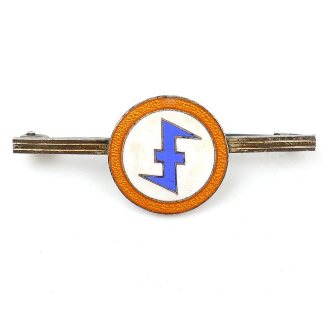 NSB - WA Membership Badge (WA-Draagteken). The Dutch 'Nationaal-Socialistische Beweging' (National Socialist Movement) was founded by 'Anton Mussert' in December 1931 and was a Dutch pro-German Nazi Party. This badge was worn by the members of the 'NSB'-related: 'Weerafdelingen' (being more or less the equivalent of the German SA or 'Sturmabteilungen'). The pin shows some normal scratches and traces of usage and is in overall good condition. The badge is nicely mounted on hard to find a mini-bar/clasp, having a functional pin-back device. The badge is maker-marked on the back with the logo 'HFB'. The badge has the colours of the 'Princevlag' and was introduced by 'Van Geelkerken' in june 1938. These badges are only used for a very short period of time and are almost impossible to find, scarce original example in good used condition.