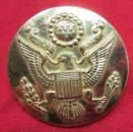 Original era manufacture. Emergency type Army enlisted hat device of gold painted plastic instead of strategic brass metal. Complete with its attaching nut excellent detail.
