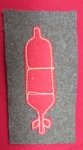 Original era manufacture. Red wool felt Trench Mortar bomb, machine sewn onto a olive wool rectangle. Measures 2 x 4 inches.
