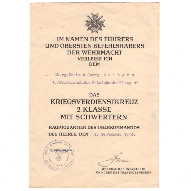 This is an Award Document (Urkunde) for the War Merit Cross 2nd Class with Swords (Kriegsverdienst Kreuz 2. Klasse mit Schwerter) with accompanying letter. The War Merit Cross was instituted by Adolf Hitler on 18 October 1939. This DIN-A5 sized document was awarded to Obergefreiten 'Georg Seibert', he was a member within 4. / Feldeisenbahn-Betriebsabteilung 19. This document was handed to him on 1 September 1944 and personally signed by 'Rudolf Gercke' (Recipient of the Knight's Cross of the War Merit Cross with swords (Ritterkreuz des Kriegsverdienstkreuz mit Schwertern)). The document is in good condition and unfolded. Nice original award document.