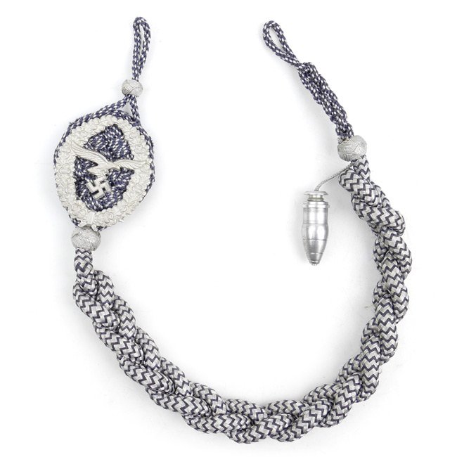 Luftwaffe FLAK Shooting Lanyard (Schützenschnur) 6th Grade (6.Stufe). The 1st to 4th grade lanyards are made of twisted bluish-grey with interwoven aluminum threads whereas the 5th till 8th grade are made of twisted aluminum thread with interwoven bluish-grey threads. This is an aluminum thread with interwoven bluish-grey threads example having one aluminum artillery shell attached indicating the 6th grade as intended for a soldier within the Anti-Aircraft Artillery (FLAK). The aluminum shield is mounted on a rosette base in the same material as the lanyard with a stitched on, protective, Luftwaffe blue/grey wool backing. This lanyard would look great when re-attached to a Luftwaffe FLAK tunic or 'Waffenrock'. The lanyard is in very good condition with light age and usage toning. Rare and hard to find original lanyard in very good condition.