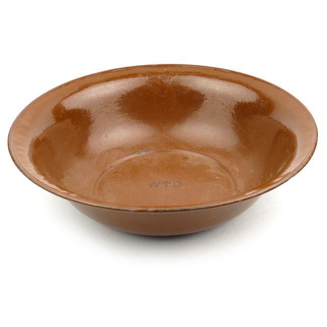World War 2 British Enamel Bowl, the brown enamel bowl is nicely War Department and Broad-Arrow marked. The bowl is approximately 10cms high and 37cms in diameter. Nice original and not often seen enamel bowl.