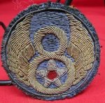 Original era manufacture. Beautiful toned wire embroidery on a lighter blue cotton backing material. Remnants of a black paper covering remain on the reverse.