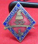 Original era manufacture. Pinback enameled obverse badge, maker marked on the reverse. Measures 23 x 30 mm.
