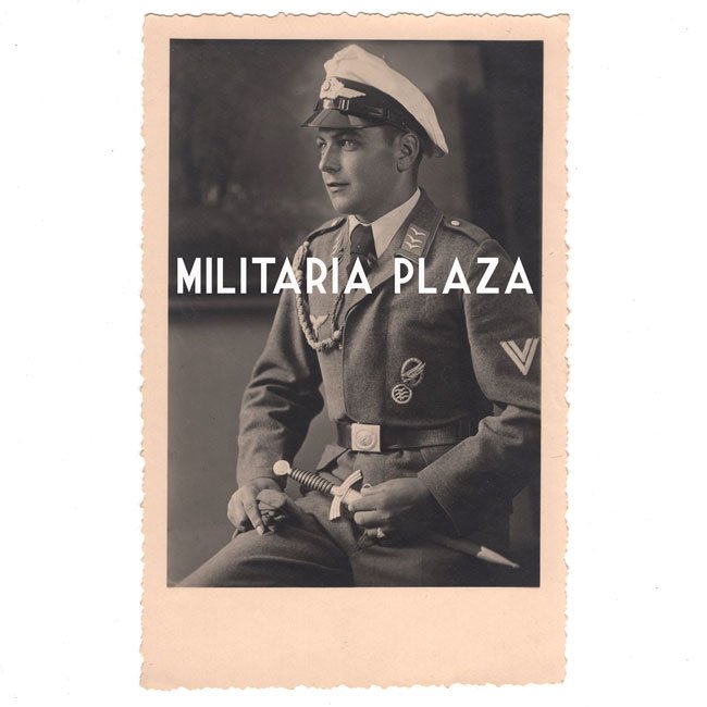 This is a Luftwaffe Fallschirmjäger portrait photograph. Nice quality portrait showing a Luftwaffe 'Obergefreiter' wearing his flight blouse and summer visor cap. A Luftwaffe Paratrooper Badge and a 'Segelflieger C-Abzeichen' are visible on his left-breast. He's holding a First Pattern Luftwaffe Dagger (Fliegerdolch). The photograph measures 8,5 x 13,5 cms (postcard size). Rare original paratrooper portrait photo.