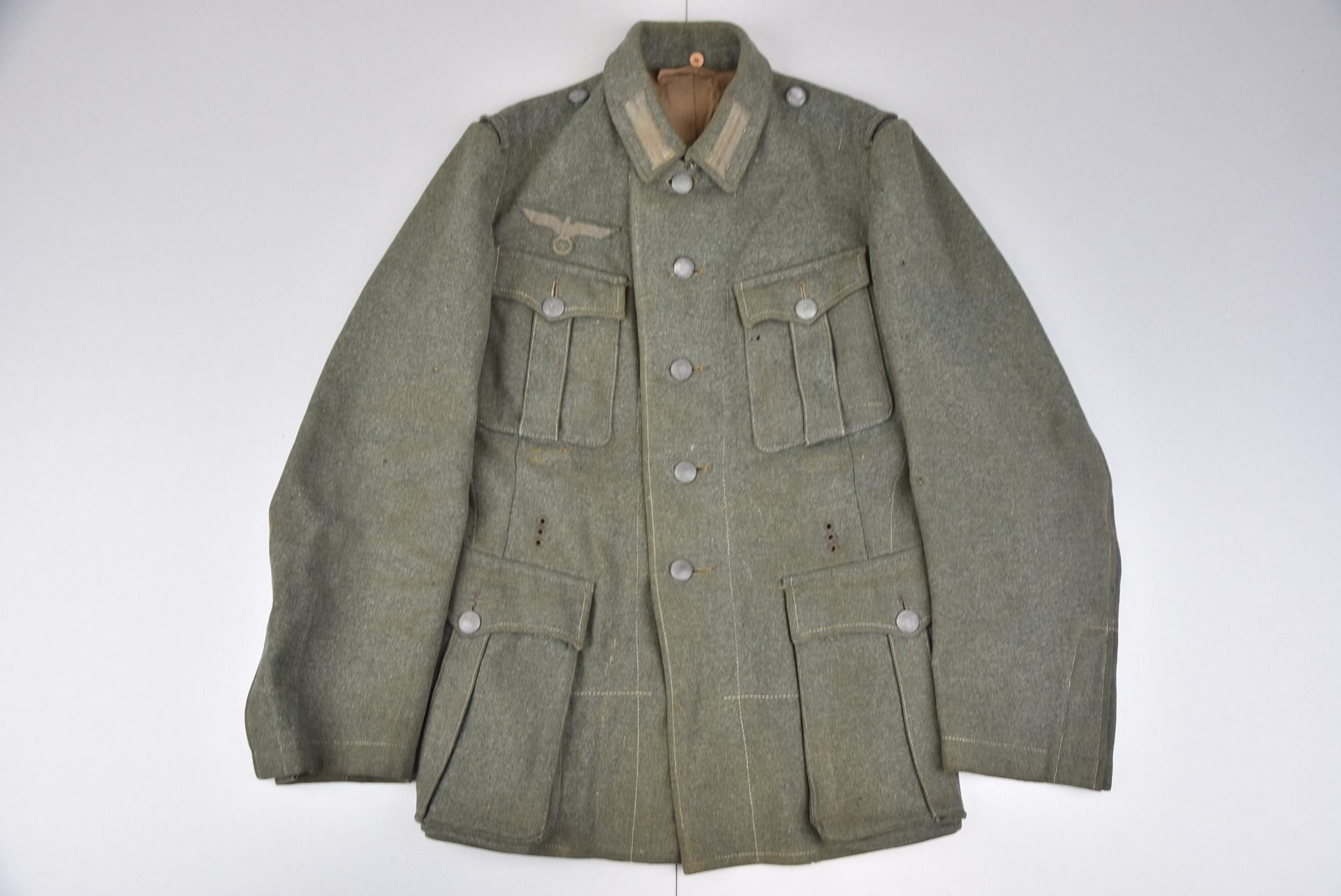 Genuine M40 pattern Feldbluse in light worn condition. The Feldbluse is complete with all of its period applied insignia. The eagle remains untouched, being machine applied on top and finished by hand; the so called zip-and-flip methode. The jacket has not been shortened or re-tailored and retains it full length and has pleats in the bottom pockets. Size marked and dated inside 1941 (I deem). Maker marks faded. Shows modest wear and has a few small damages, all pictured. Long time ago since I have encountered an untouched Feldbluse like this, not many left for sale on todays market.