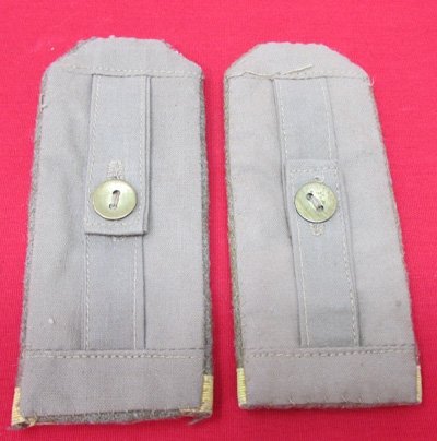 Original era manufacture. A near matched pair of slip-on shoulder straps in the rank of Corporal. Dark olive wool covered boards with a gold brocade strip at the bottom and a single brass star at center. I have also seen these referred to as cadet. Light age and wear.These are a near match, just a slight shade difference in the wool.
