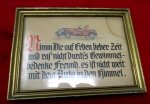 Original period manufacture. This little sign has hung on the wall of our garage for many years, Terri and I have always had an interest in vintage cars, both of British and German manufacture. The basic gist I believe is pay attention while you are driving, ' Better take your time on earth and don't race through the swarming mind friend, it's not far from the car to heaven'. Anyway, it's in it's original gold painted wood frame, the lettering and car are all hand done, small moisture stain in the upper right corner. Measures 7.5 x 5.5 inches.