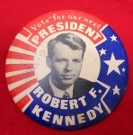 Original era manufacture. A large style, 6 inch width, campaign button for the 1968 Presidential Campaign of Robert F. Kennedy. His campaign ended in tragedy when he was assassinated in Los Angeles after winning the California Primary.
